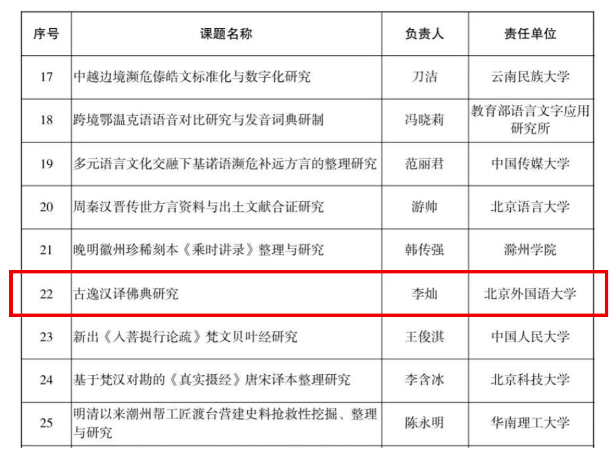 获批第五个国社科冷门绝学专项。此前,刘钊副教授获批“回鹘文《金光明经》语言研究”项目;周利群副教授获批“梵藏汉文佛经中的时间测量文献整理与研究”项目;王嘉副教授获批“中国明清小说越南国语字译本文献整理与研究”项目;马仲武副教授获批“斯里兰卡早期僧伽罗语佛教文献整理研究”项目。